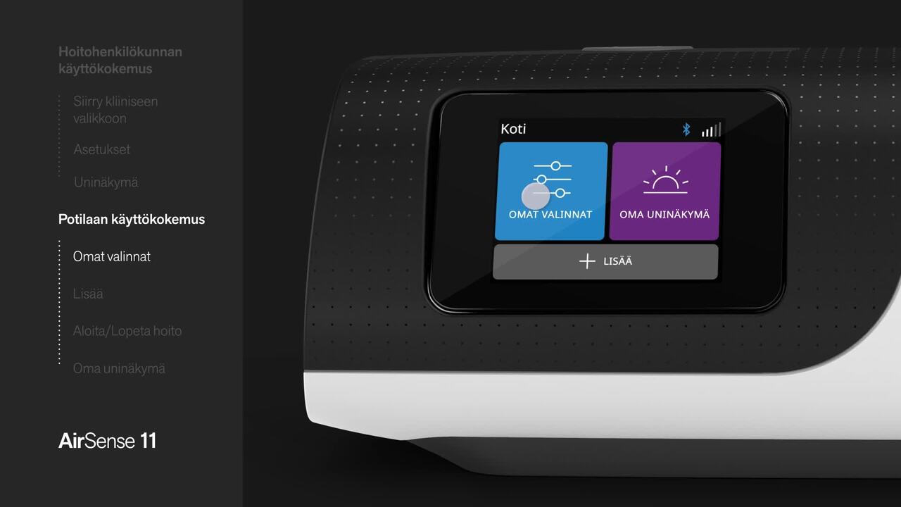 AirSense 11 -laitteen käyttäjillä on käytettävissään henkilökohtainen avustaja, joka opastaa potilaita laitteen ja maskin käyttöönotossa ohjevideoiden avulla. Potilas voi kokeilla erilaisia hoitopainetasoja sekä tarkistaa maskin tiiviyden ja opetella parantamaan maskin istuvuutta hoitoon totutteluun tarkoitetulla Testikäyttö-toiminnolla. Lisää tukityökaluja löydät tukisivustoltamme.
